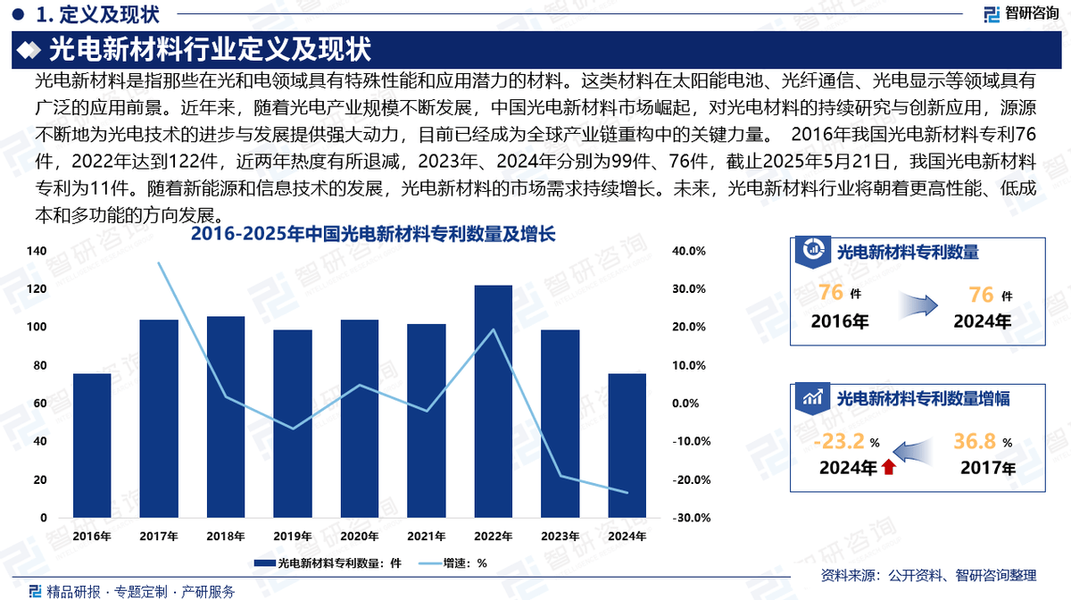 近年来,跟着光电家产界限不时繁荣,中邦光电新原料市集兴起,对光电原料的不断商讨与立异操纵,源源不时地为光电技能的前进与繁荣供应强壮动力,目前曾经成为环球家产链重构中的环节气力。据统计,2016年我邦光电新原料专利76件,2022年到达122件,近两年热度有所退减,2023年、2024年判袂为99件、76件,截止2025年5月21日,我邦光电新原料专利为11件。