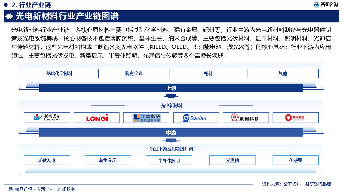 光电新原料行业家产链上逛重心原原料苛重征求根源化学原料、珍稀金属、靶材等;行业中逛为光电新原料制备与光电器件创制及光电体例集成,重心制备技能征求薄膜浸积、晶体成长、纳米合成等,苛重征求光伏原料、显示原料、照明原料、光通讯与传感原料,这些光电原料组成了创制各样光电器件(如LED、OLED、太阳能电池、激光器等)的重心根源;行业下逛为操纵界限,苛重征求光伏发电、新型显示、半导体照明、光通讯与传感等众个高增加界限。